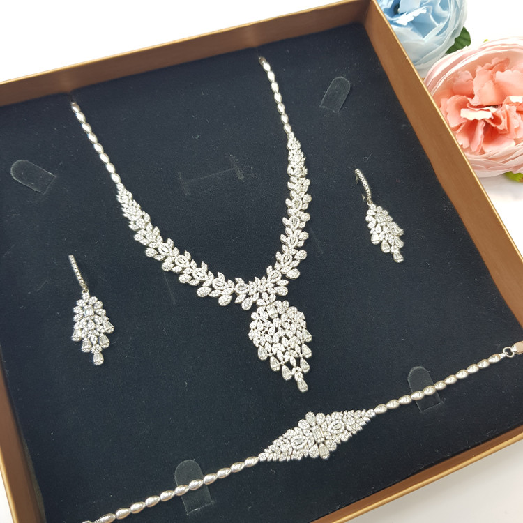سرویس نقره جواهری زنانه مجلسی با عیار استاندارد 925 نقره باآبکاری طلا سفید (رادیوم) بدون حساسیت و سازگار با پوست های حساس و کپی نمونه جواهری ارسال به همراه فاکتور معتبر و رسمی با جعبه مخصوص