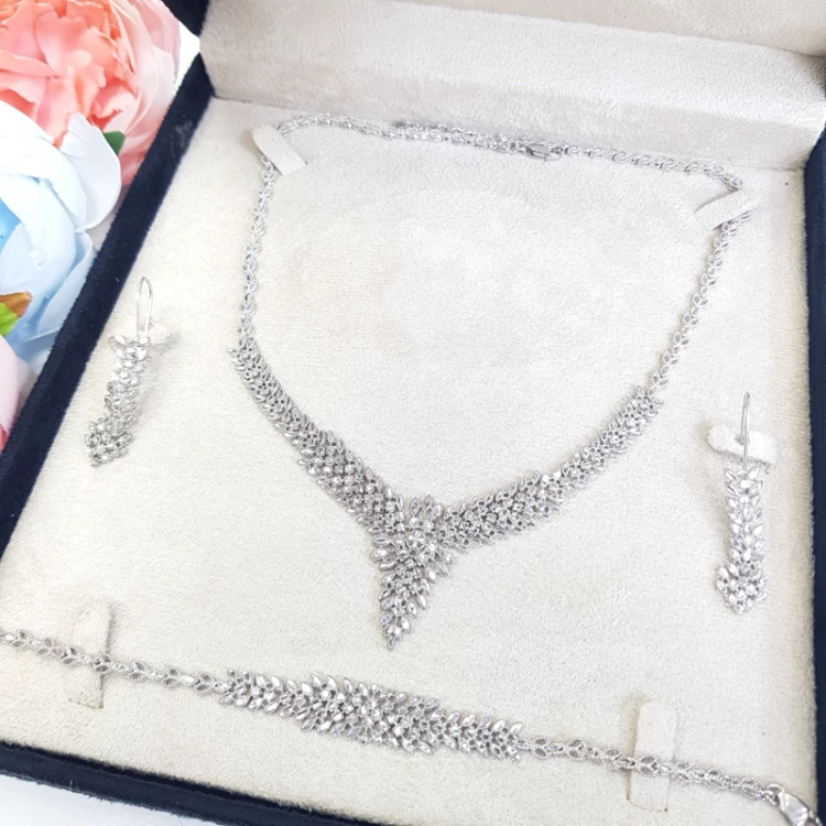 سرویس نقره تراش خور زنانه مجلسی با عیار استاندارد 925 نقره باآبکاری طلا سفید (رادیوم) بدون حساسیت و سازگار با پوست های حساس و کپی نمونه جواهری ارسال به همراه فاکتور معتبر و رسمی با جعبه مخصوص (ارسال رایگان)