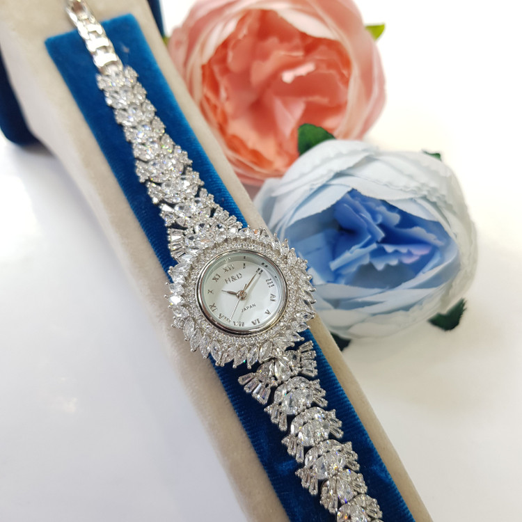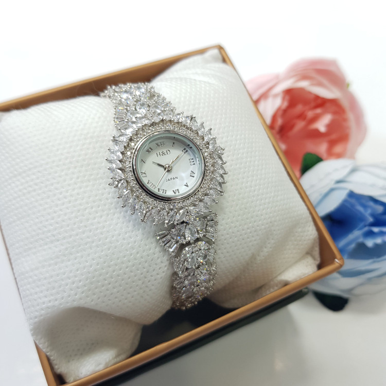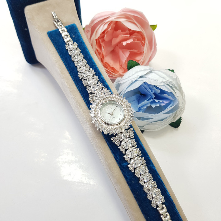 ساعت نقره زنانه جواهری مجلسی با عیار استاندارد 925 و آبکاری رادیوم (طلا سفید) بدون حساسیت پوستی و سازگار با پوست های حساس با ضمانت 5 ساله موتور ساعت و ارائه به همراه فاکتور معتبر و رسمی به همراه جعبه مخصوص