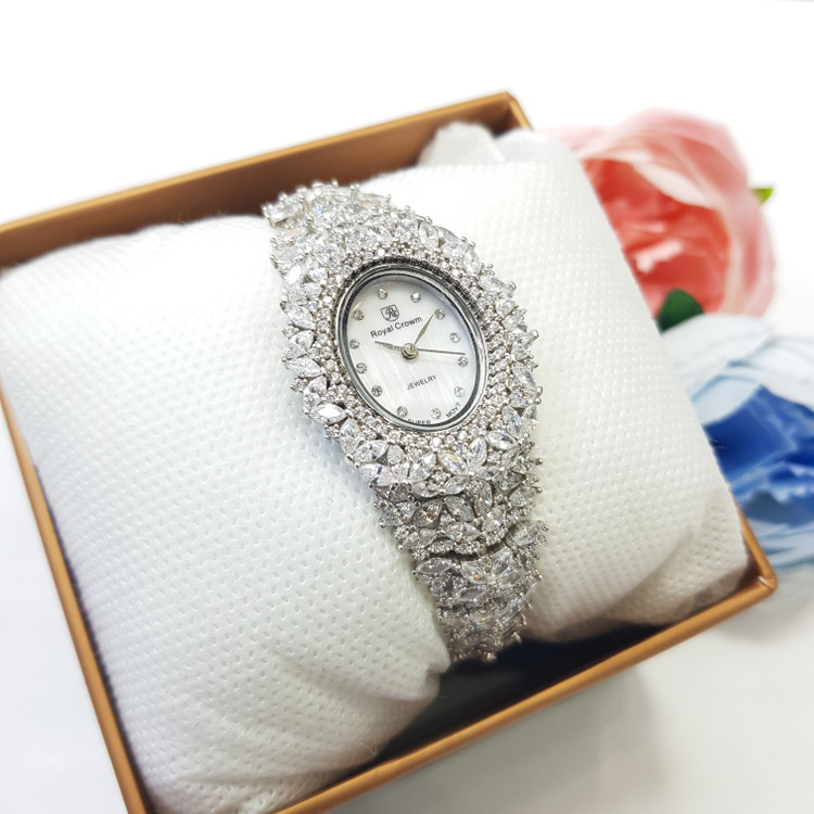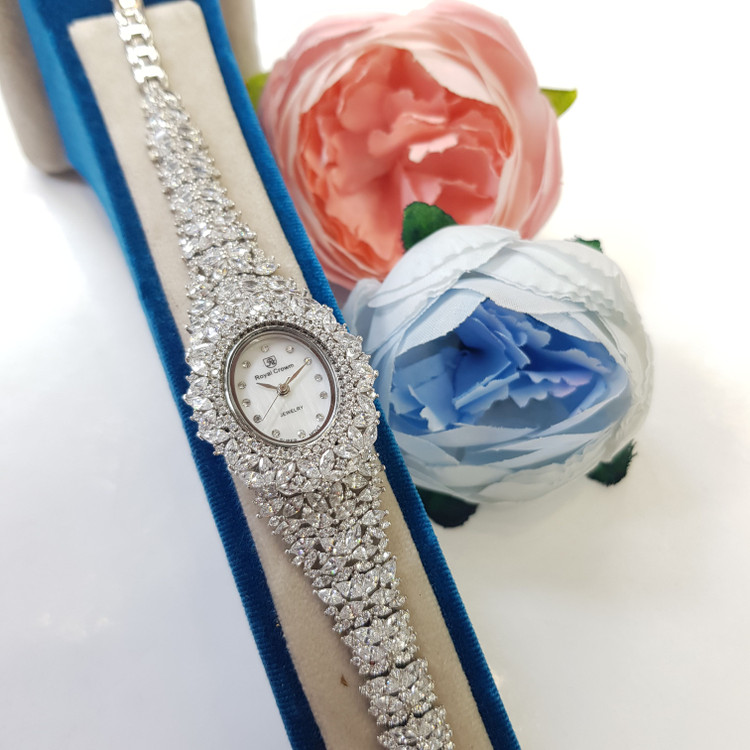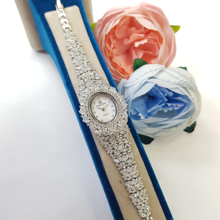 ساعت نقره زنانه جواهری مجلسی با عیار استاندارد 925 و آبکاری رادیوم (طلا سفید) بدون حساسیت پوستی و سازگار با پوست های حساس با ضمانت 5 ساله موتور ساعت و ارائه به همراه فاکتور معتبر و رسمی به همراه جعبه مخصوص