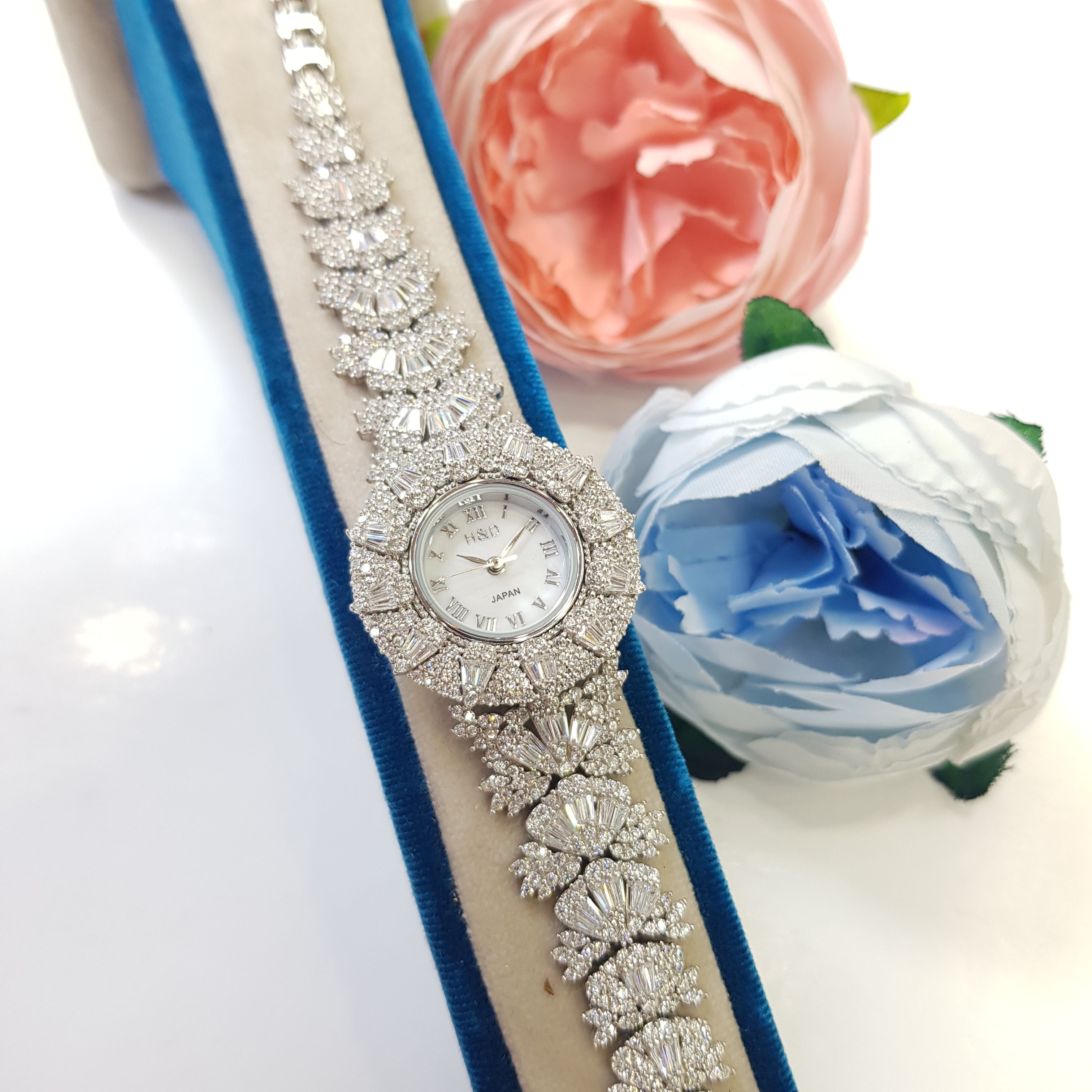 ساعت نقره زنانه جواهری مجلسی با عیار استاندارد 925 و آبکاری رادیوم (طلا سفید) بدون حساسیت پوستی و سازگار با پوست های حساس با ضمانت 5 ساله موتور ساعت و ارائه به همراه فاکتور معتبر و رسمی به همراه جعبه مخصوص