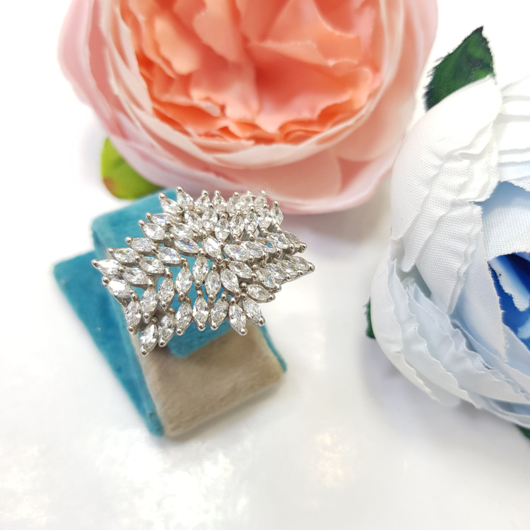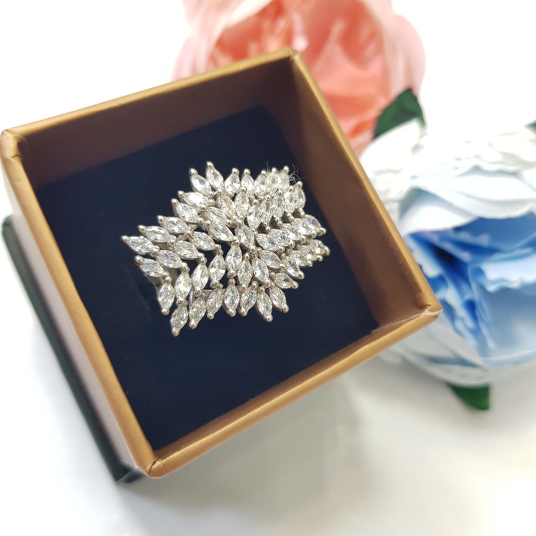 انگشتر نقره جواهری مجلسی زنانه با عیار استاندارد 925 نقره با آبکاری طلا سفید (رادیوم) ساخته شده بر پایه جواهر و سازگارد با پوست های حساس و بدون حساسیت ارسال به همراه فاکتور معتبر و رسمی زیر نظر اتحادیه و به همراه جعبه مخصوص